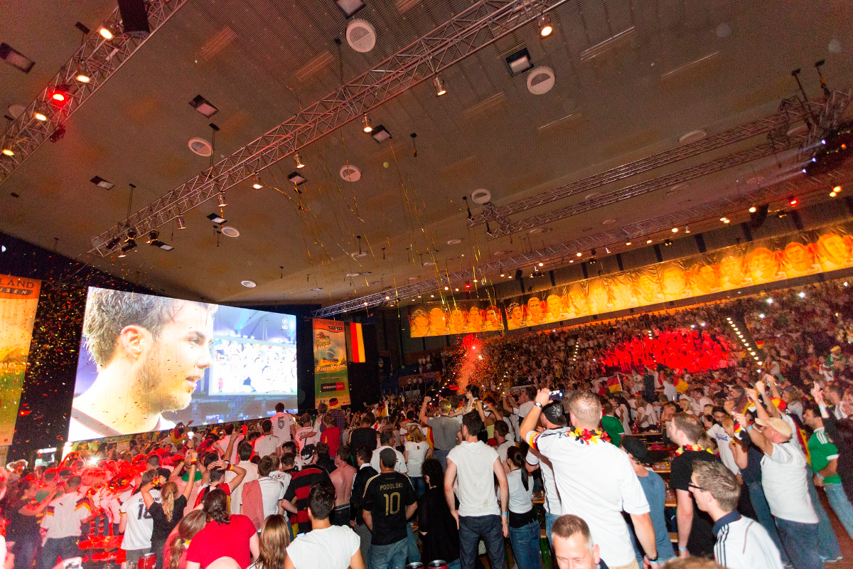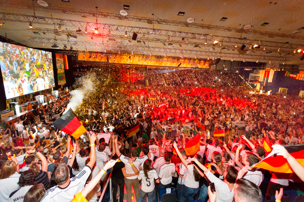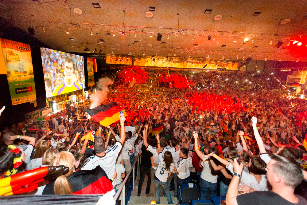 Beim 7:1 der DFB Auswahl jubelten die Fans in der Gruga Halle Essen. Die 11-Freunde-WM-Arena hatte die gesamte Region zum Rudelgucken eingeladen und über 1000 Deutschland Menschen waren gekommen.